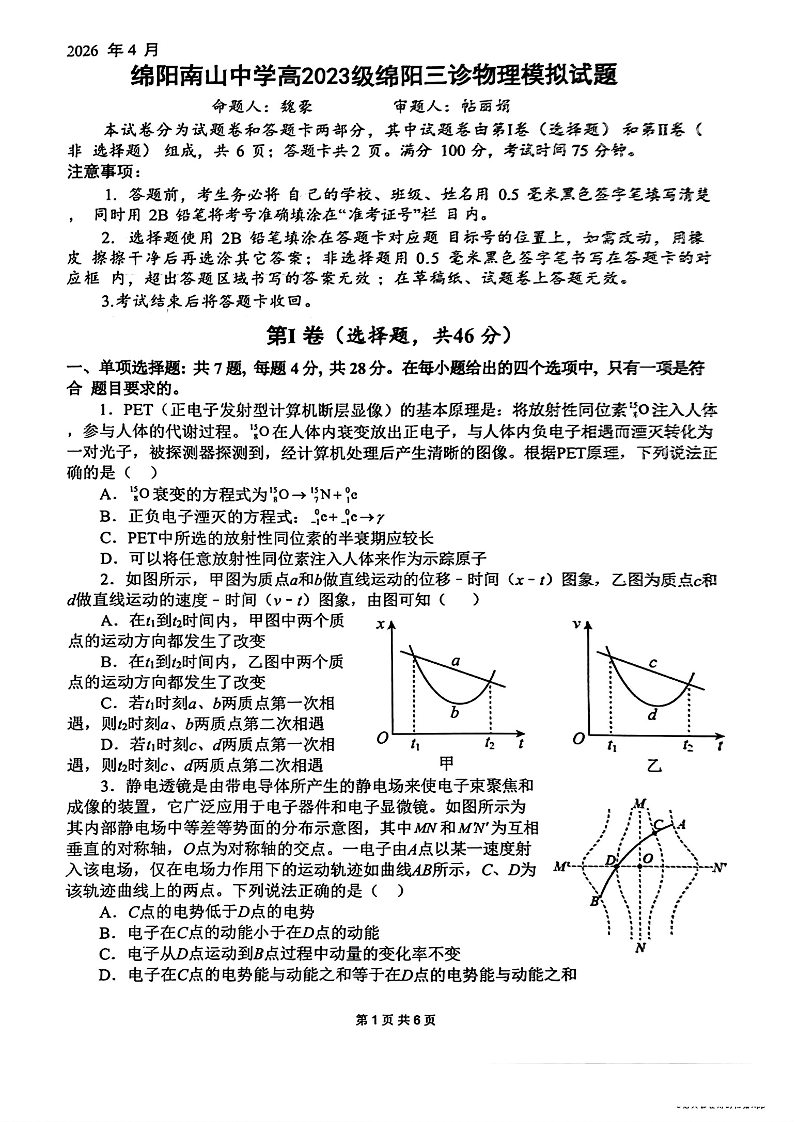 绵阳南山中学高2023级高考模拟考试 物理试题(含答案).pdf
