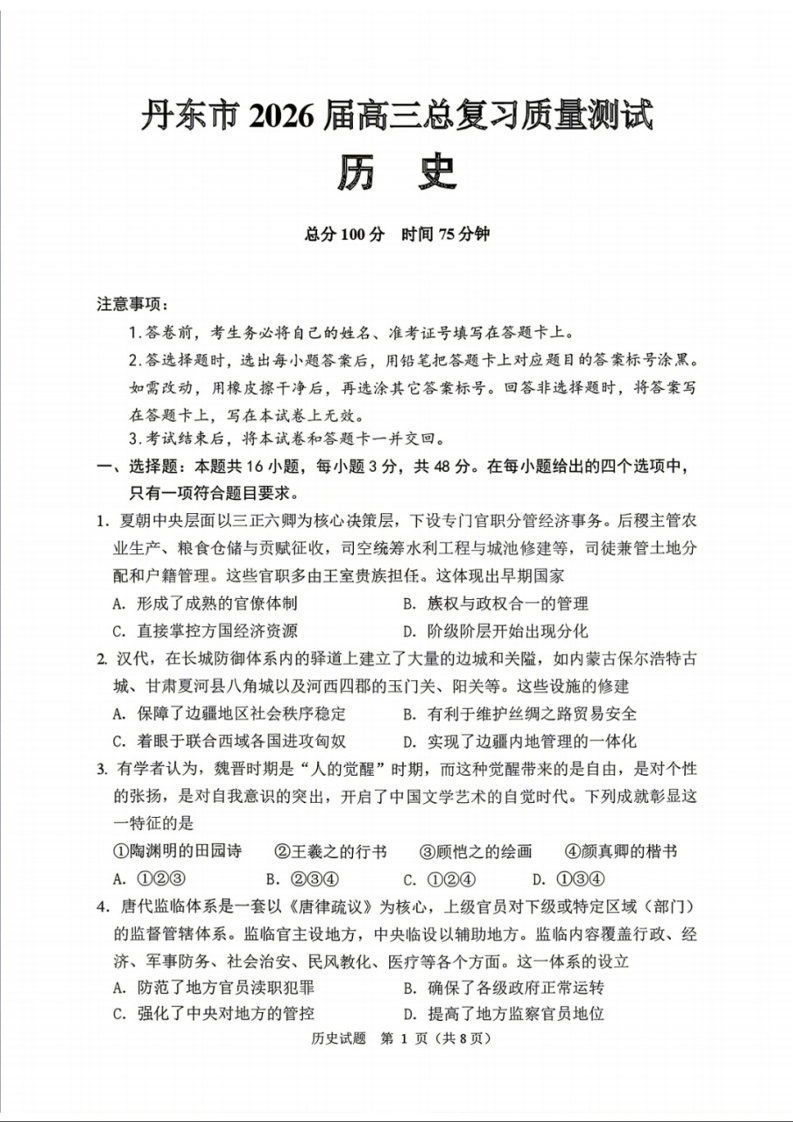 辽宁省丹东市2026届高三年级教学质量监测 历史.docx