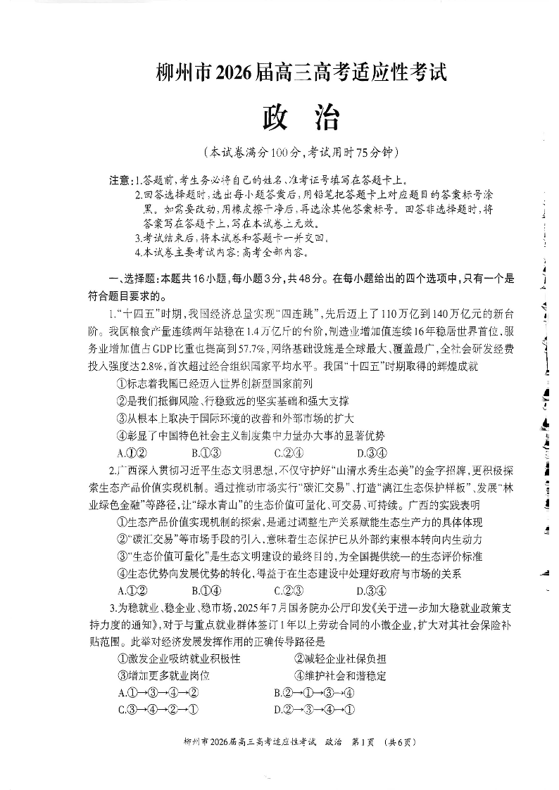 广西壮族自治区柳州市2026届高三年级高考适应性考试 政治.pdf