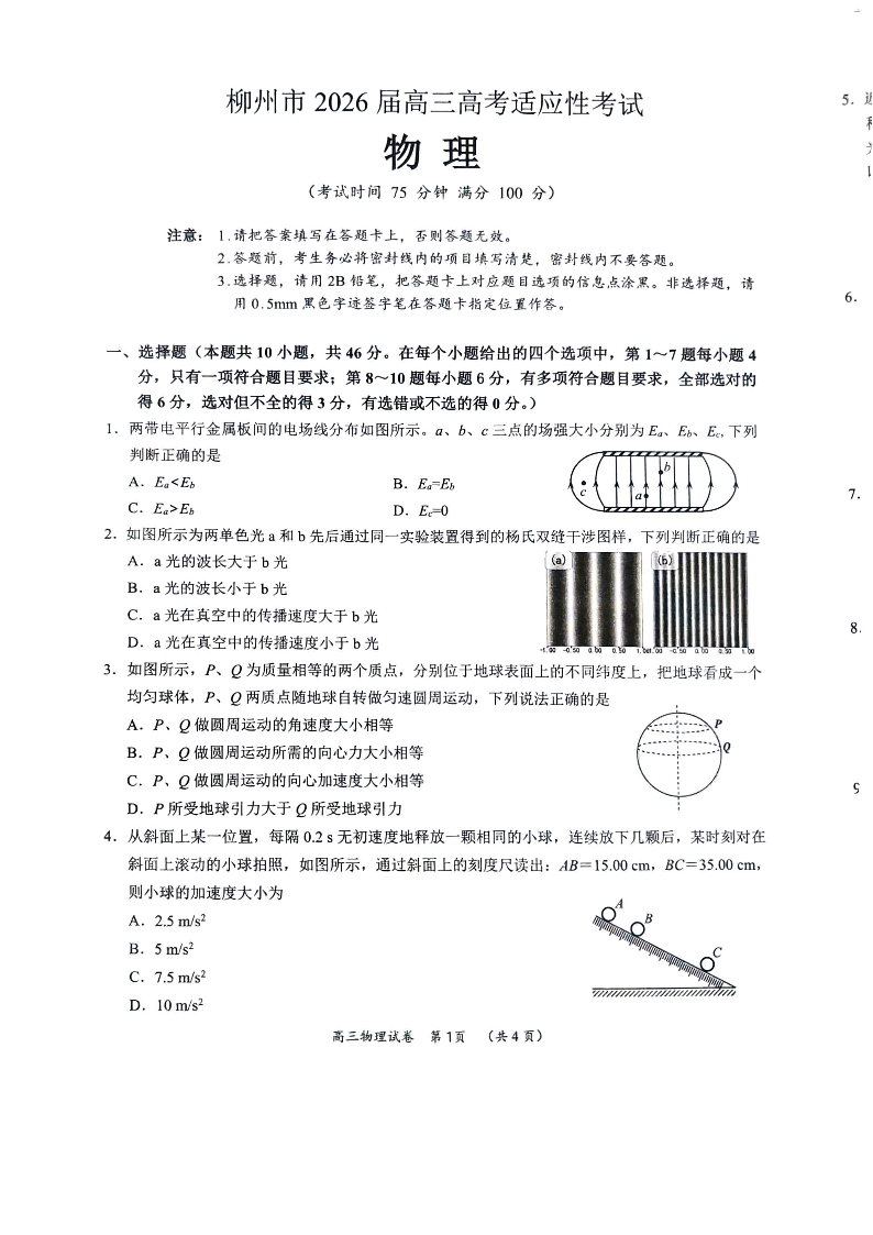 广西壮族自治区柳州市2026届高三年级高考适应性考试 物理.pdf