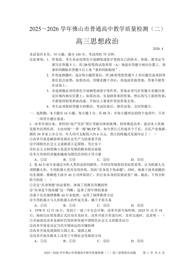 广东省2025-2026学年佛山市普通高中高三年级教学质量检测(二)政治.pdf