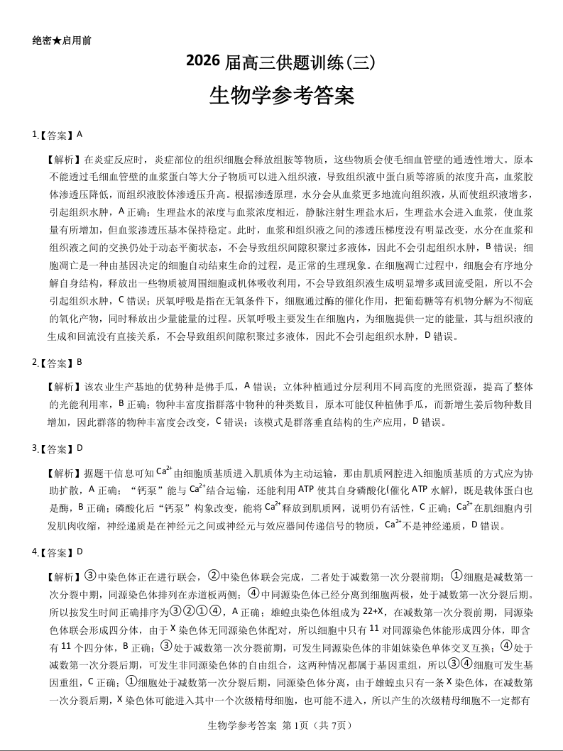 2026届高三供题训练(三)生物参考答案.docx