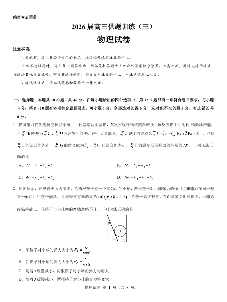 2026届高三供题训练(三)物理试题.docx