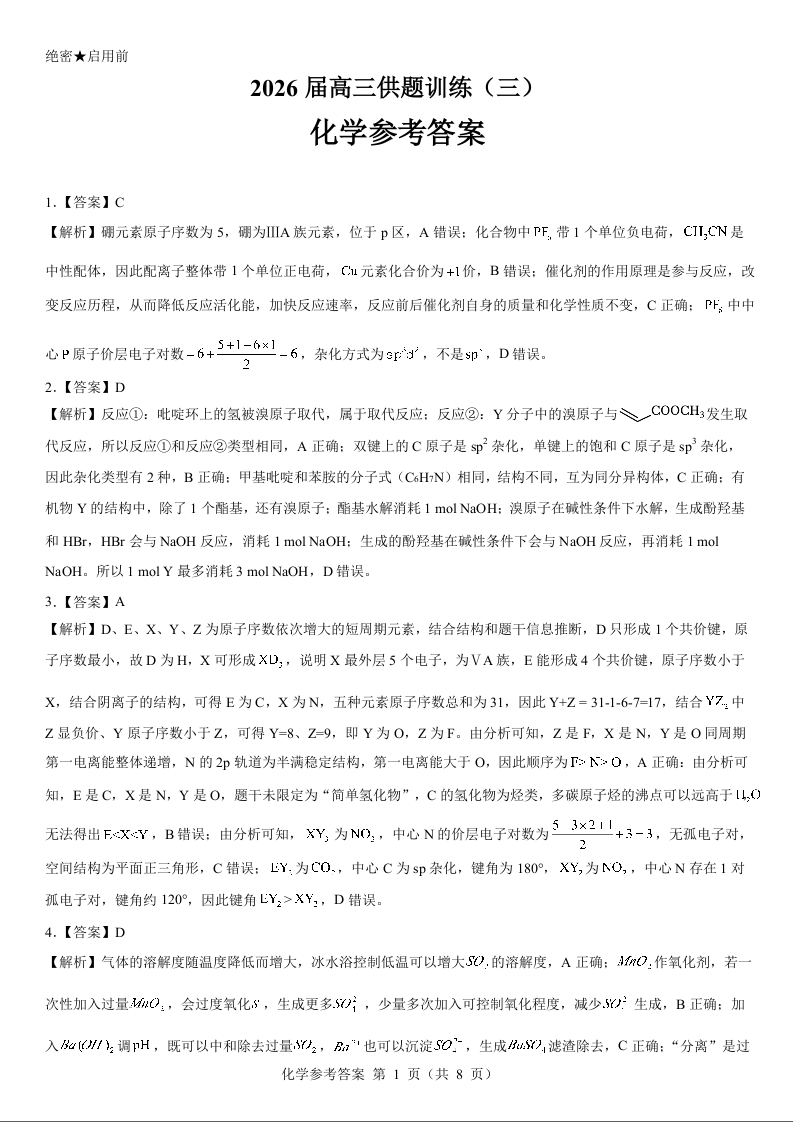 2026届高三供题训练(三)化学参考答案.docx