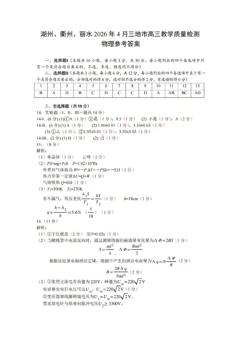 湖州、衢州、丽水2026年4月三地市高三教学质量检测 物理答案.pdf