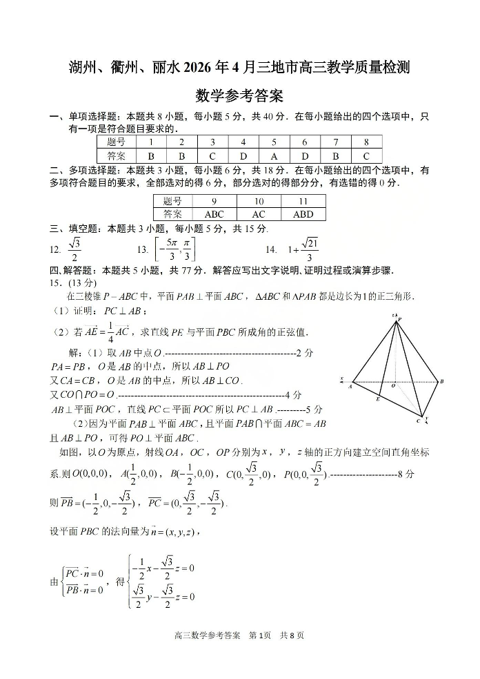 湖州、衢州、丽水2026年4月三地市高三教学质量检测 数学答案.pdf