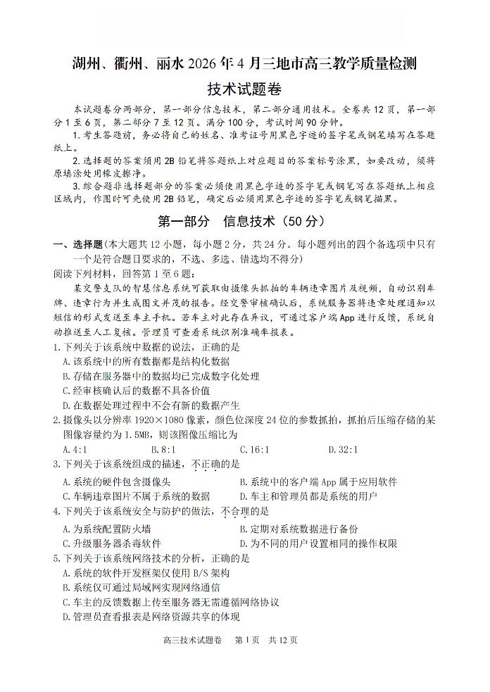 湖州、衢州、丽水2026年4月三地市高三教学质量检测 技术.pdf