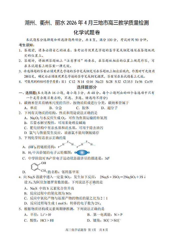 湖州、衢州、丽水2026年4月三地市高三教学质量检测 化学.pdf