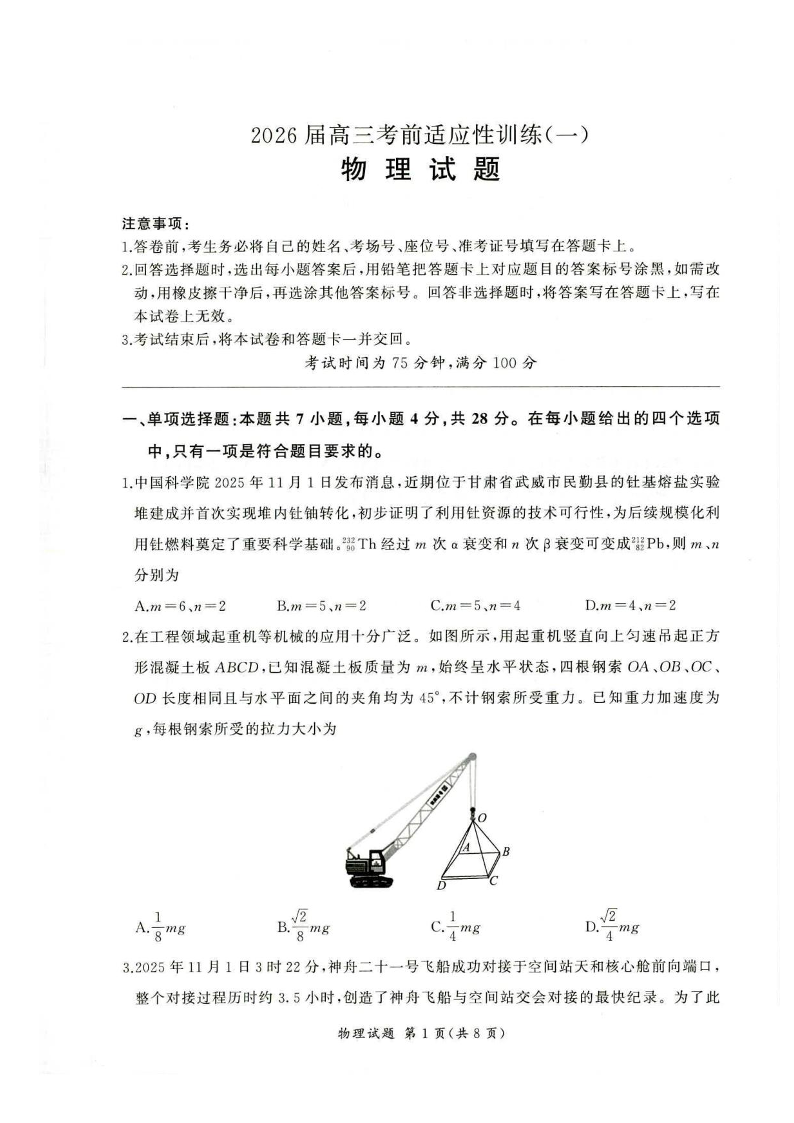 百师联盟2026届高三下学期考前适应性训练(一)物理.pdf