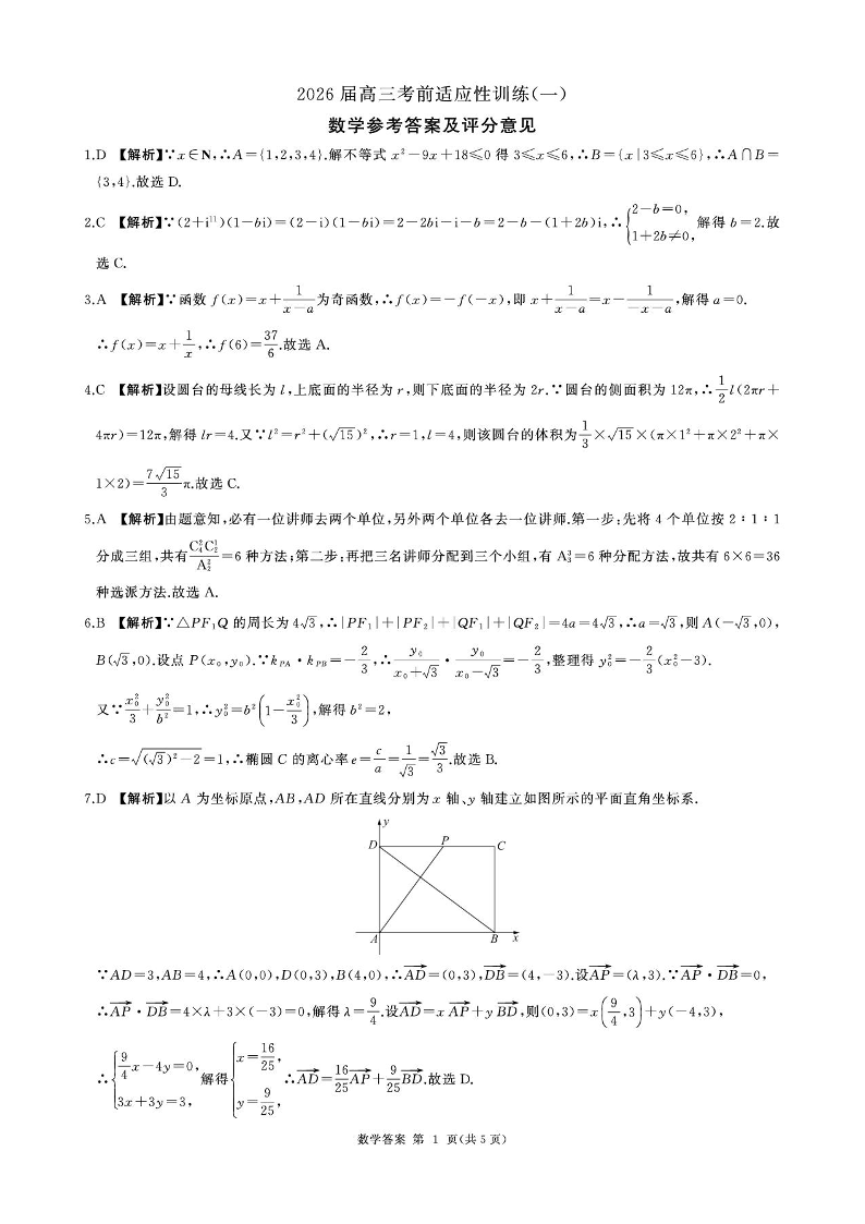 百师联盟2026届高三下学期考前适应性训练(一)数学答案.pdf