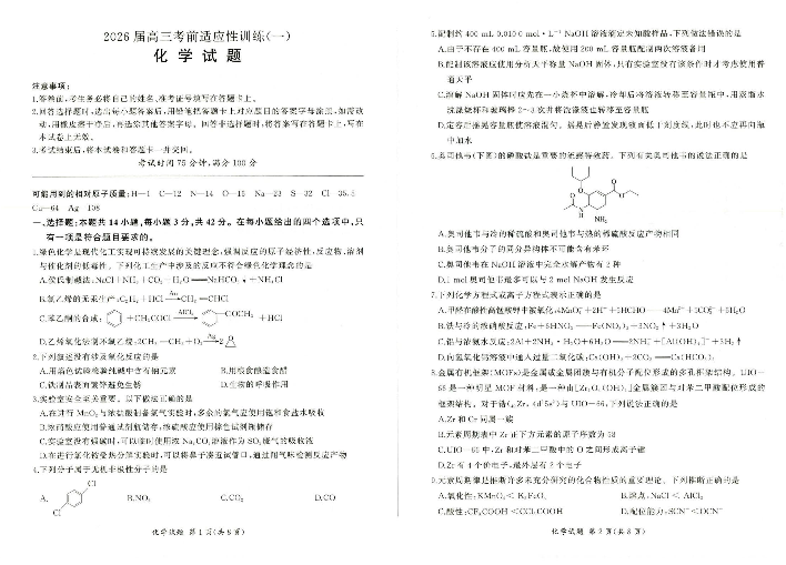百师联盟2026届高三下学期考前适应性训练(一)化学.pdf