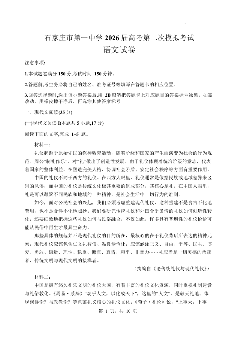 石家庄市第一中学2026届高考第二次模拟考试 语文.docx