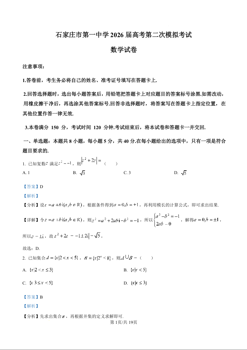 石家庄市第一中学2026届高考第二次模拟考试 数学答案.docx