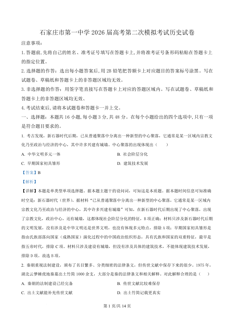 石家庄市第一中学2026届高考第二次模拟考试 历史答案.docx