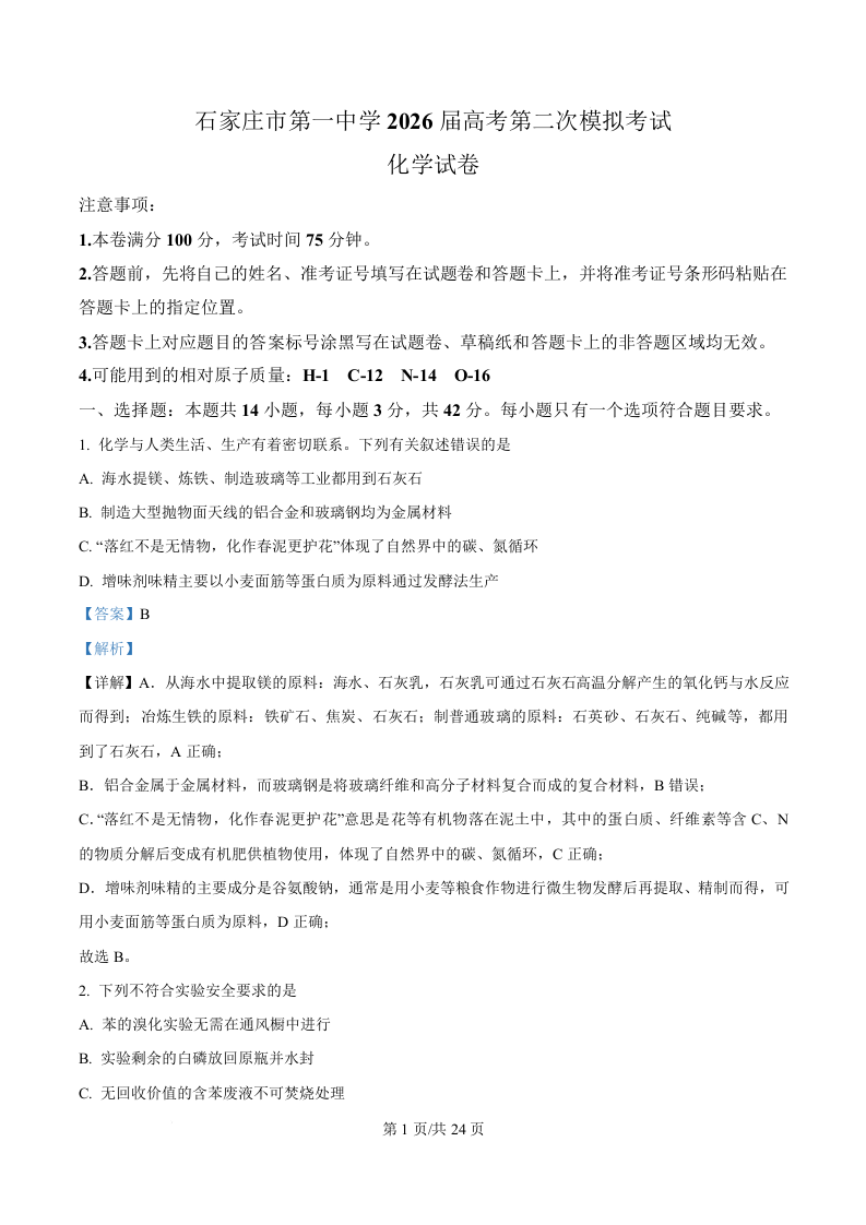 石家庄市第一中学2026届高考第二次模拟考试 化学答案.docx