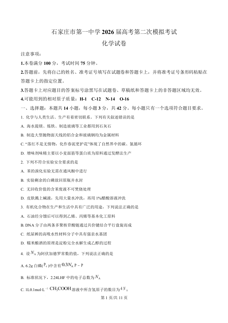 石家庄市第一中学2026届高考第二次模拟考试 化学.docx