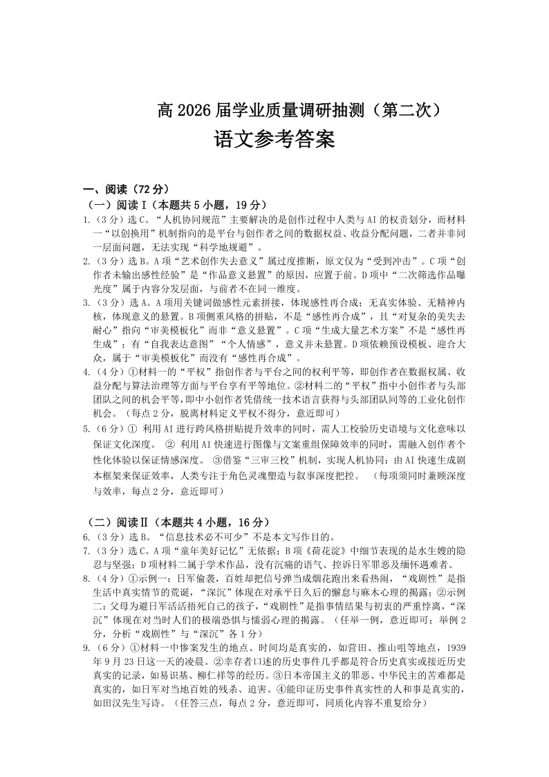 重庆九龙坡等区高2026届学业质量调研抽测 语文答案.pdf