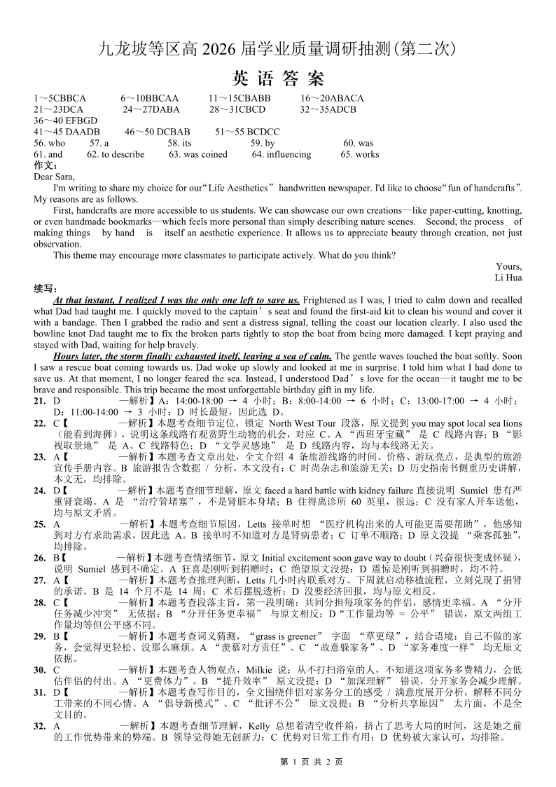 重庆九龙坡等区高2026届学业质量调研抽测 英语答案.pdf