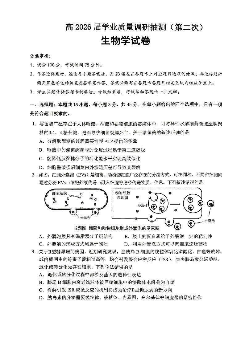 重庆九龙坡等区高2026届学业质量调研抽测 生物.pdf