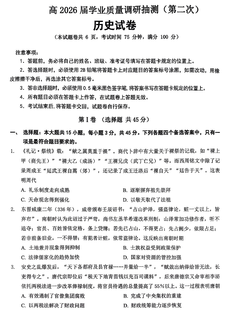 重庆九龙坡等区高2026届学业质量调研抽测 历史.pdf