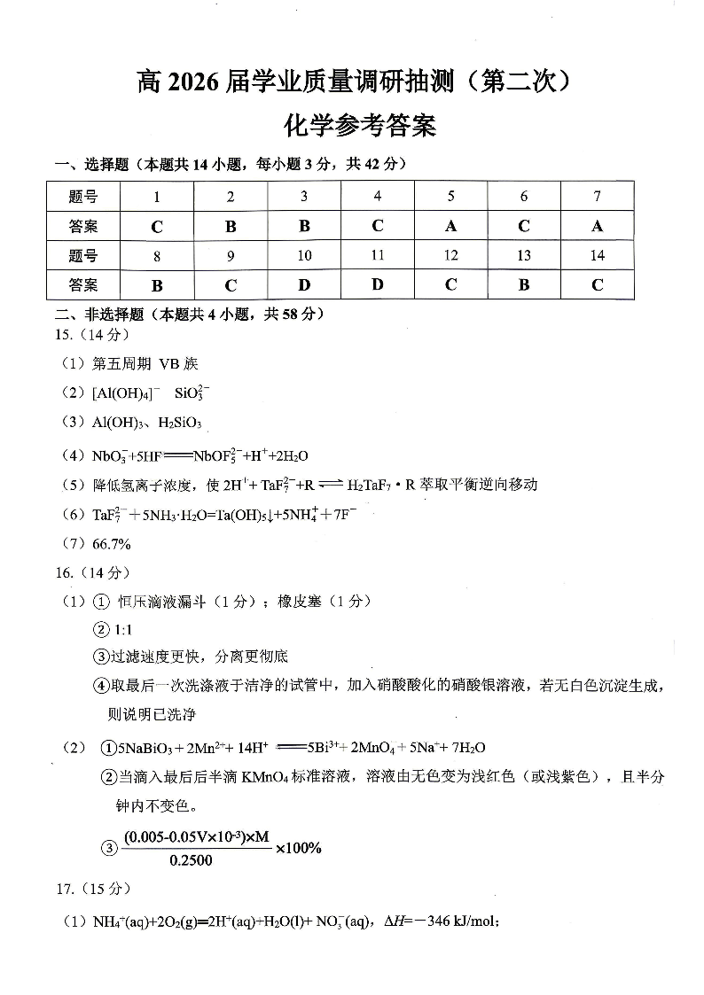 重庆九龙坡等区高2026届学业质量调研抽测 化学答案.pdf