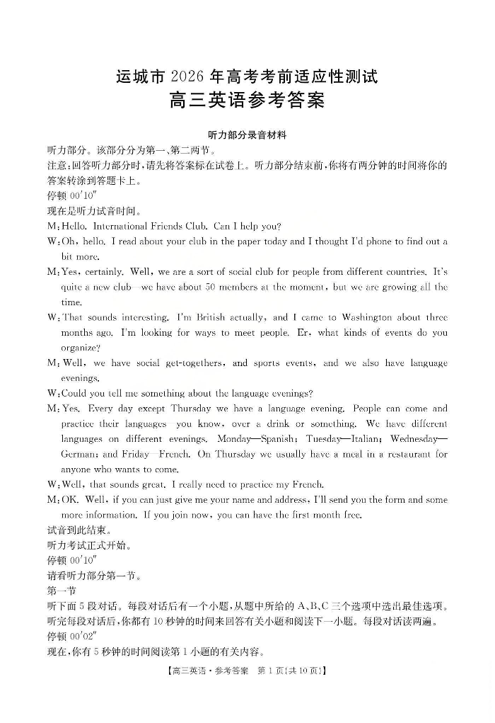 运城市2026年高考考前适应性测试 英语答案.pdf