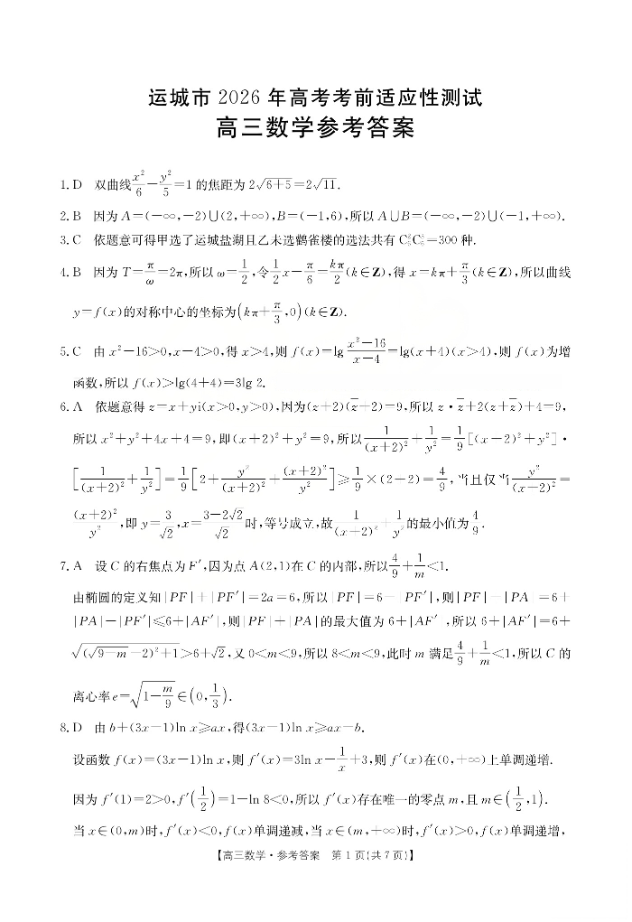 运城市2026年高考考前适应性测试 数学答案.pdf