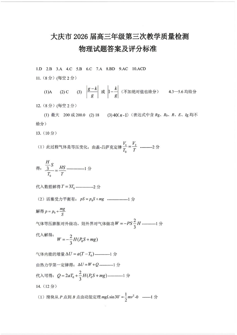 大庆市2026届高三年级第三次教学质量检测 物理答案.pdf