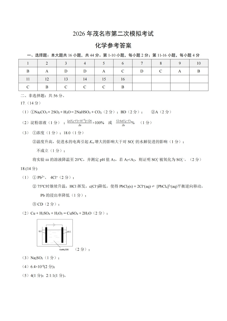 广东省2026年茂名市高三年级第二次综合测试 化学答案.pdf