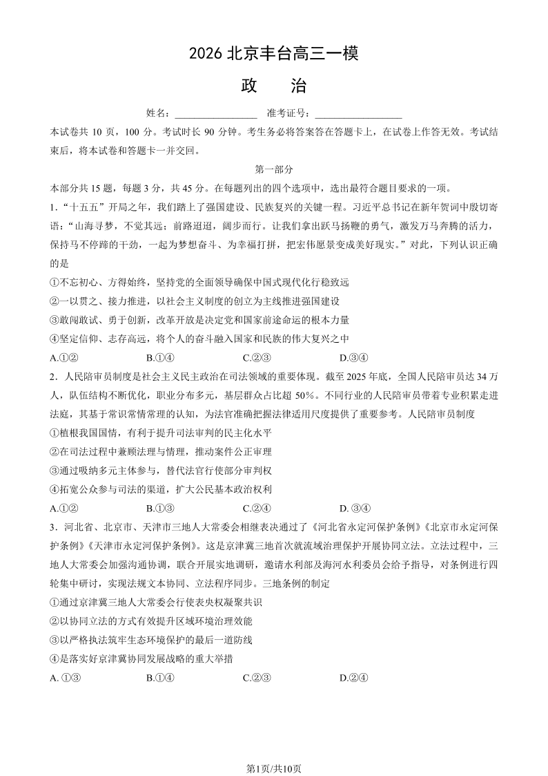 北京市丰台区2025-2026学年度高三年级第二学期综合练习(一)政治试题(含答案).pdf