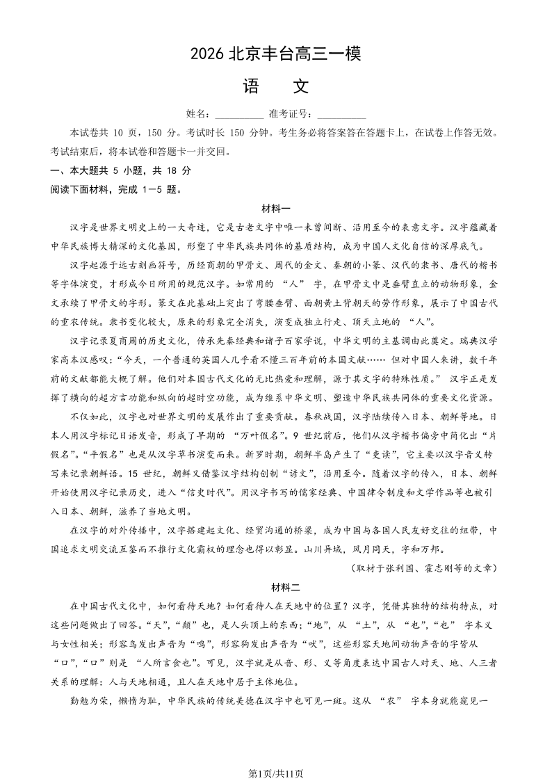 北京市丰台区2025-2026学年度高三年级第二学期综合练习(一)语文试题(含答案).pdf