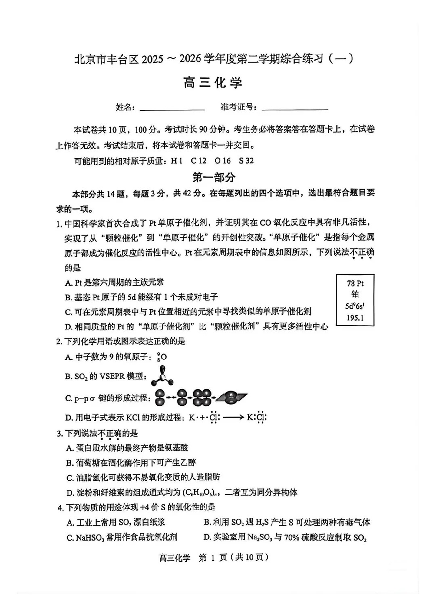 北京市丰台区2025-2026学年度高三年级第二学期综合练习(一)化学试题(含答案).pdf