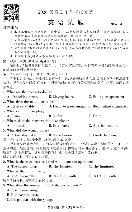 2026届高三4月模拟考试 英语.pdf