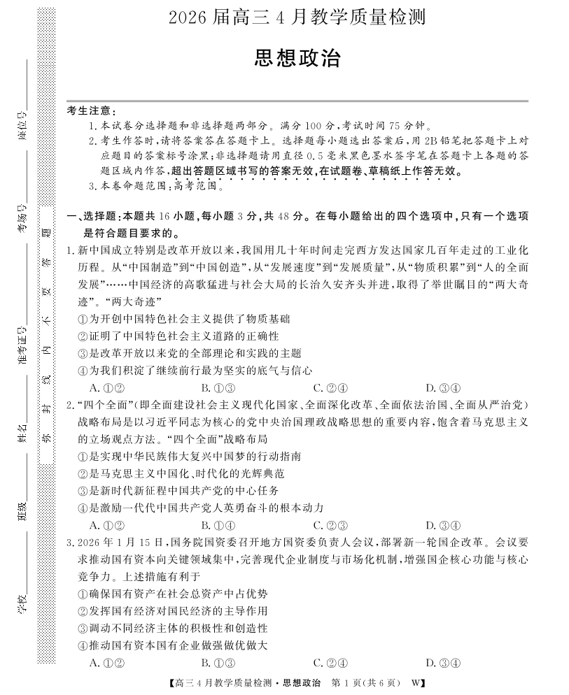 皖南八校2026届高三4月教学质量检测 政治.pdf
