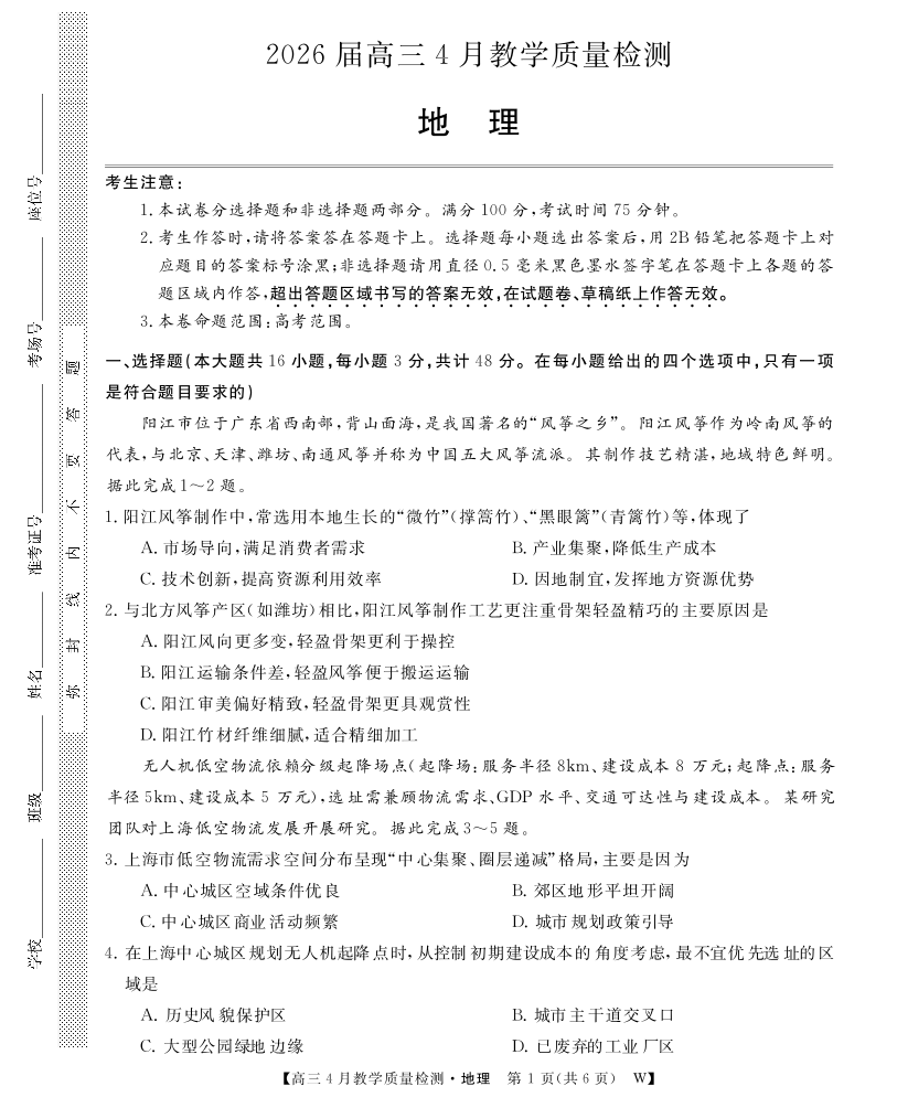 皖南八校2026届高三4月教学质量检测 地理.pdf