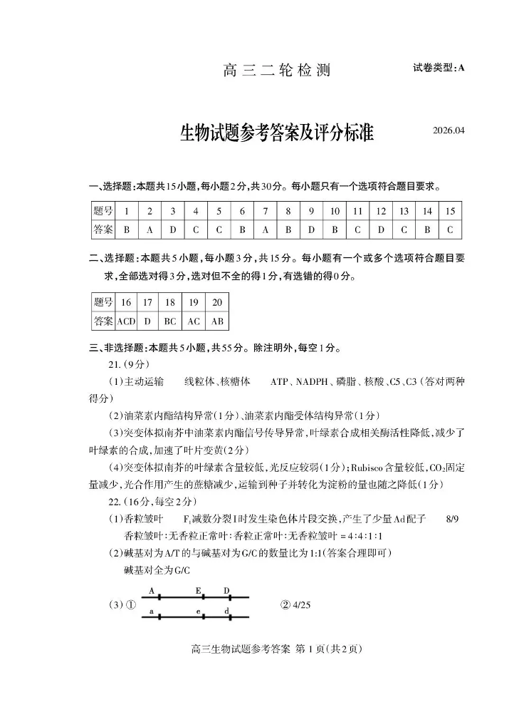 泰安市2026年高三二轮检测 生物答案.pdf