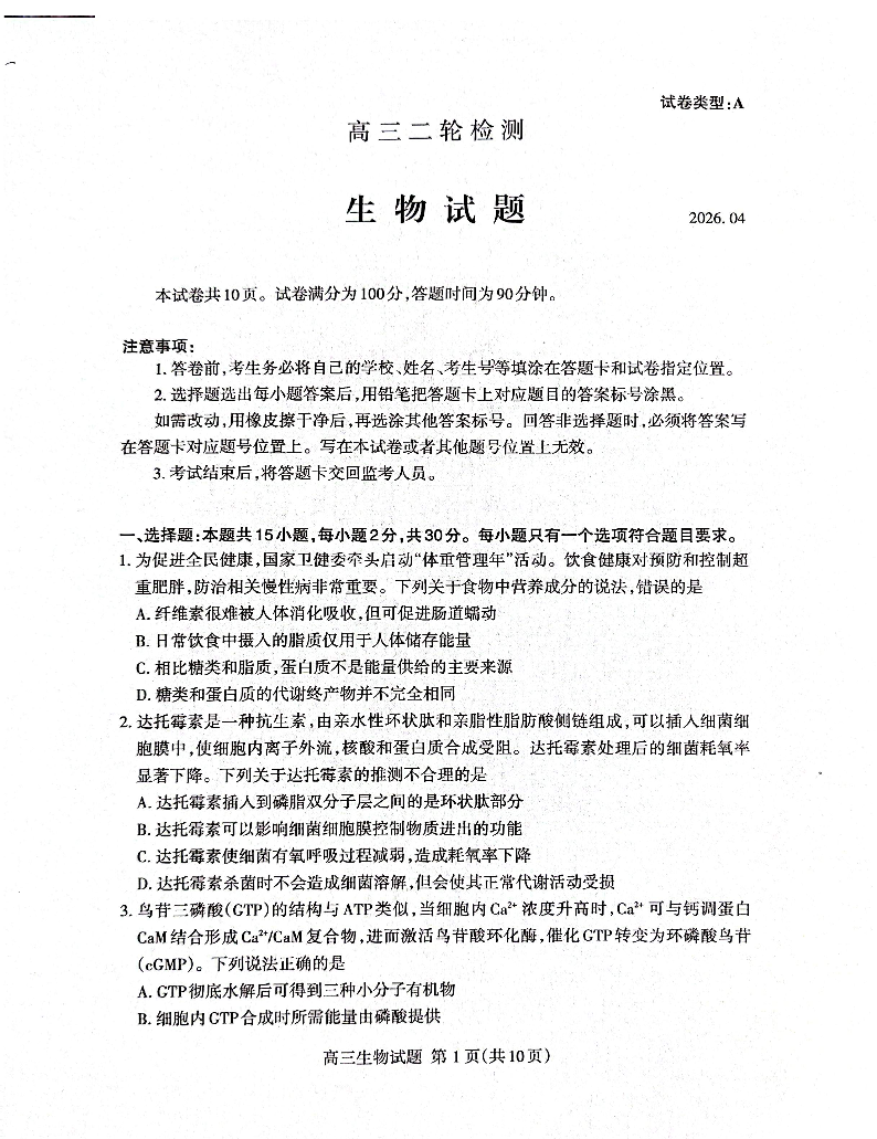 泰安市2026年高三二轮检测 生物.pdf