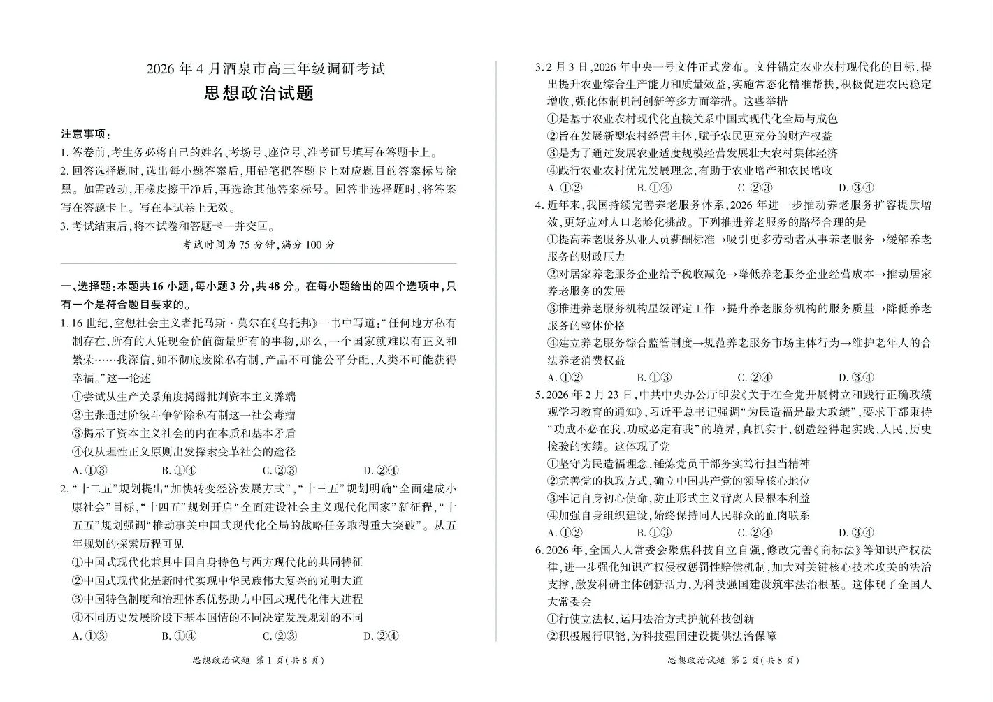 2026年4月酒泉市高三年级调研考试 政治.pdf