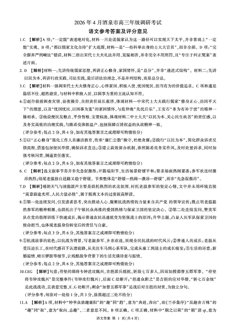 2026年4月酒泉市高三年级调研考试 语文答案.pdf