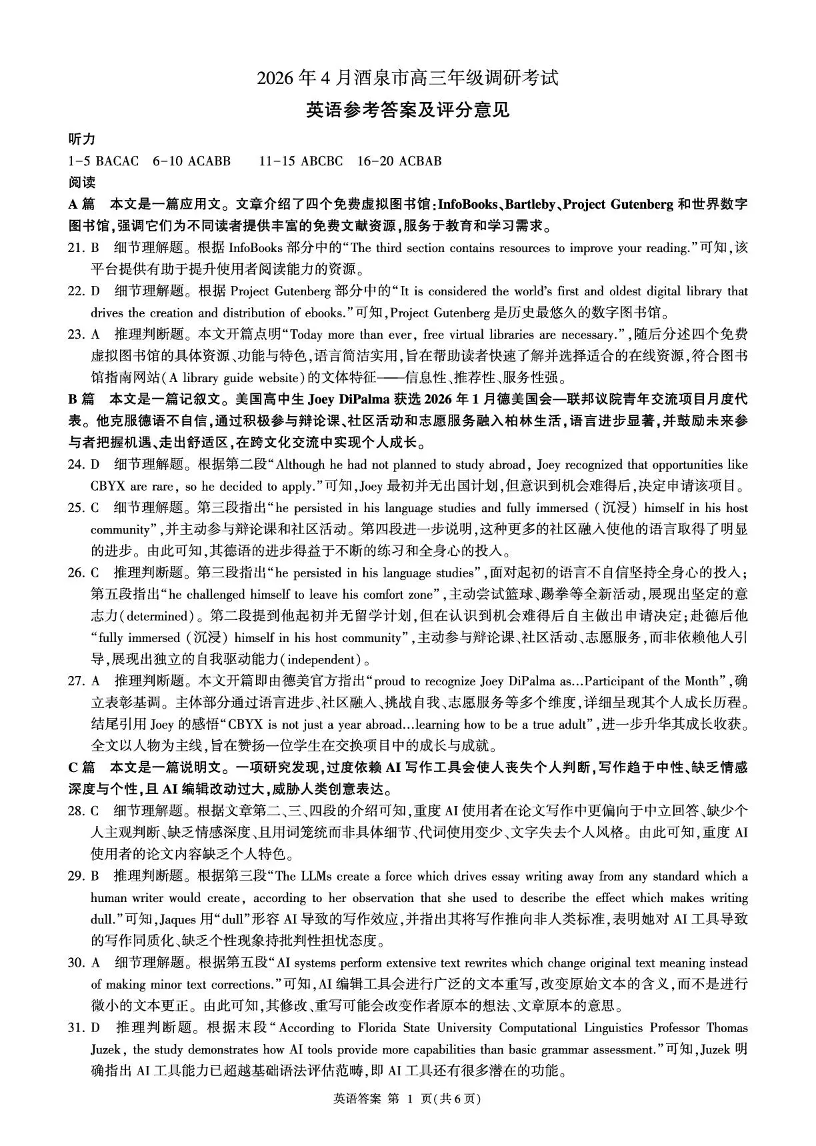 2026年4月酒泉市高三年级调研考试 英语答案.pdf