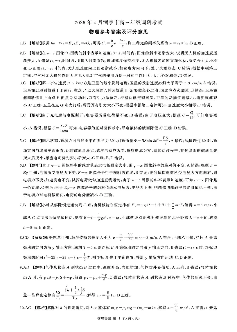 2026年4月酒泉市高三年级调研考试 物理答案.pdf