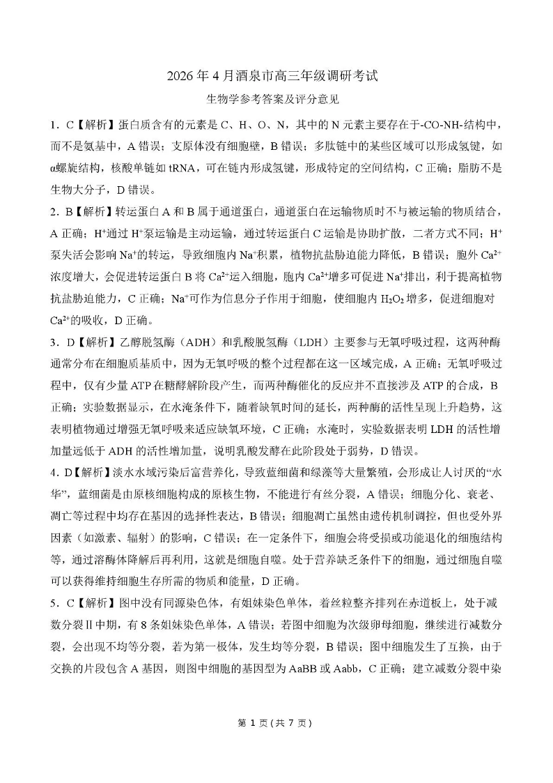 2026年4月酒泉市高三年级调研考试 生物答案.pdf