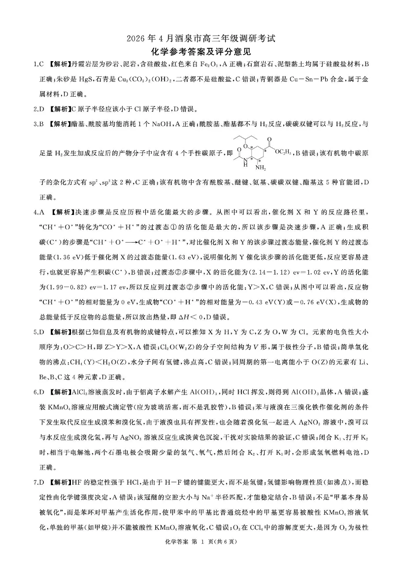 2026年4月酒泉市高三年级调研考试 化学答案.pdf