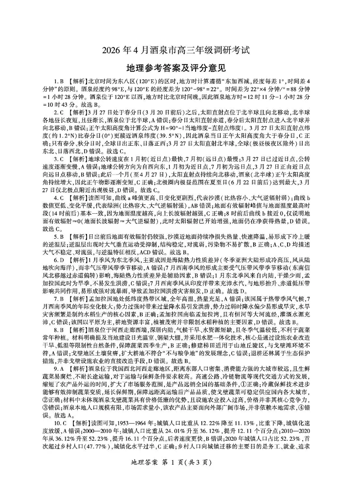 2026年4月酒泉市高三年级调研考试 地理答案.pdf