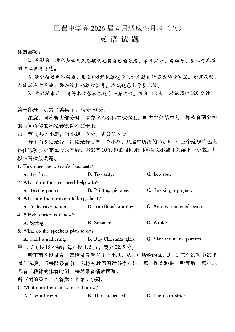 巴蜀中学2026届高考适应性月考卷(八)英语.pdf