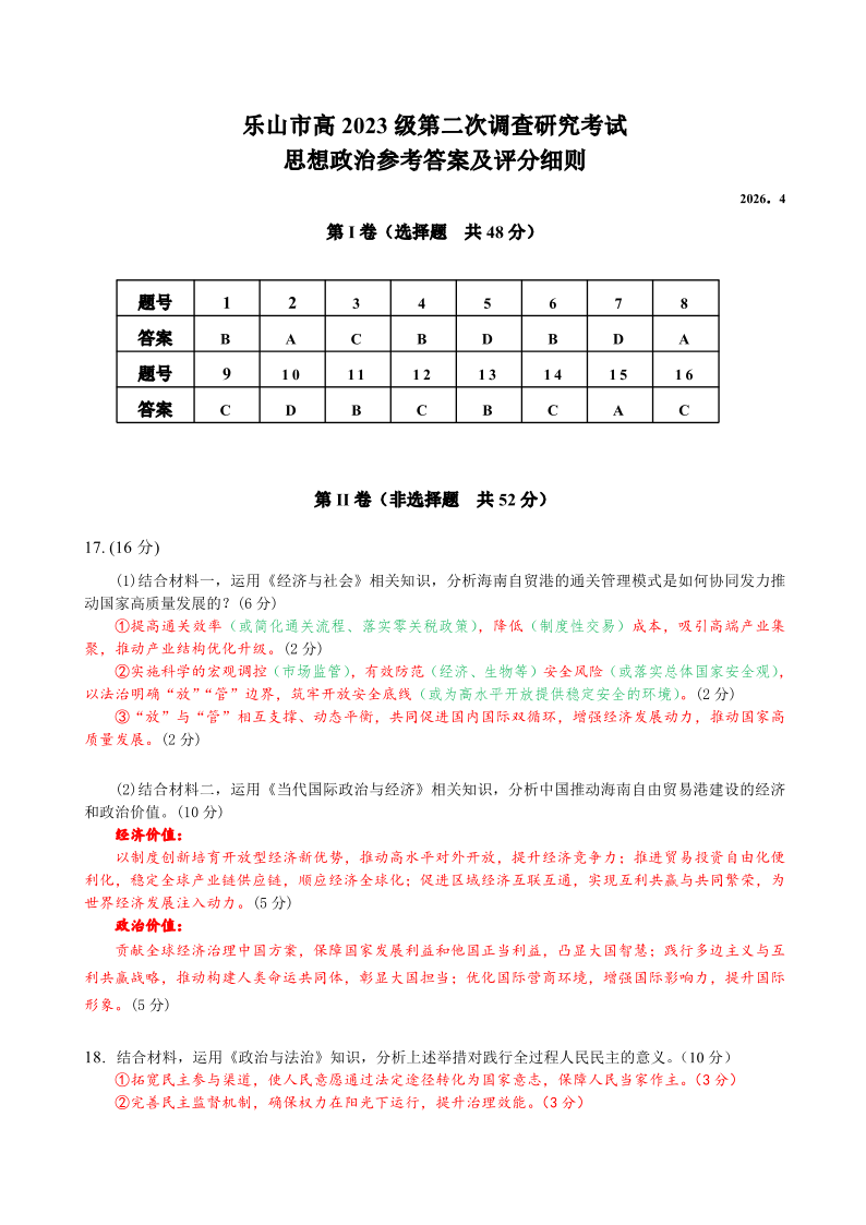 乐山市高中2023级第二次调查研究考试 政治答案.pdf