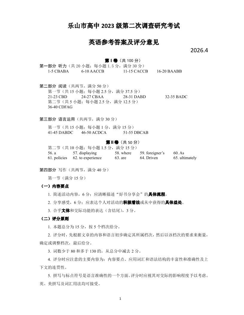 乐山市高中2023级第二次调查研究考试 英语答案.pdf