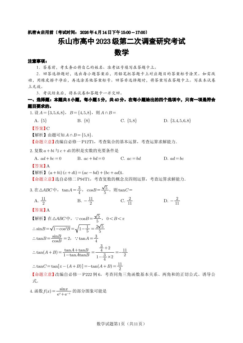 乐山市高中2023级第二次调查研究考试 数学答案.pdf