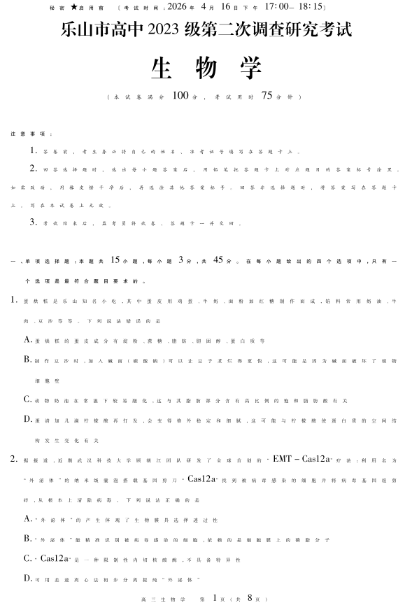 乐山市高中2023级第二次调查研究考试 生物.pdf
