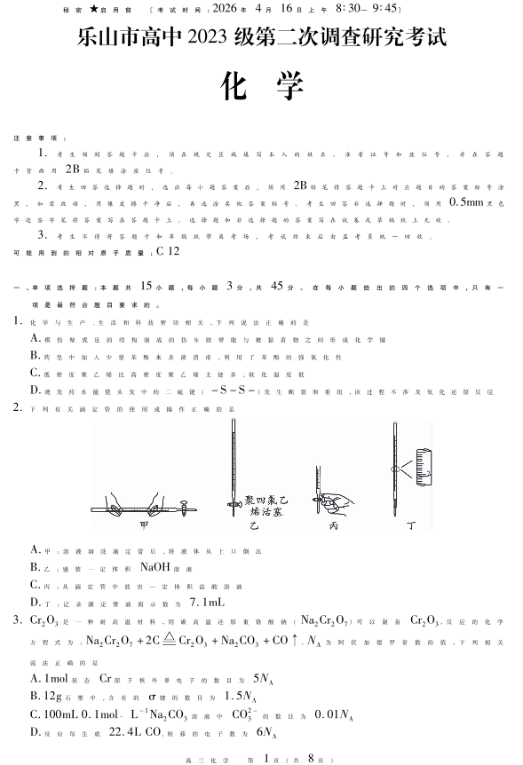 乐山市高中2023级第二次调查研究考试 化学.pdf